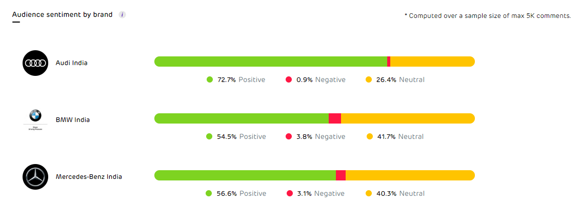 When it comes to brand sentiment on Facebook, Audi India is the brand that has received a very positive response from the audience. Meanwhile, the other 2 brands are on par with each other, in terms of the audience sentiment.
