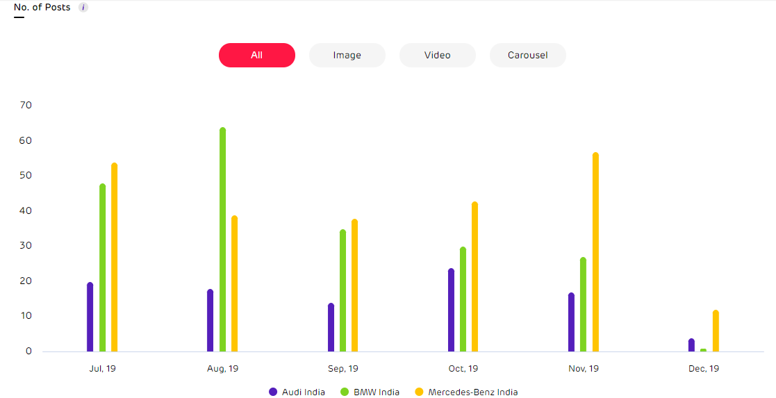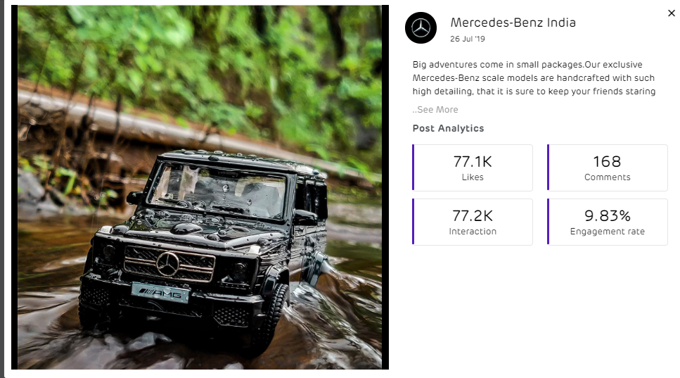On Instagram too, Mercedez Benz India leads as the most active account amongst the 3 with a total of 243 posts in the past 6 months. It also offers the most diverse content out of the 3 brands.