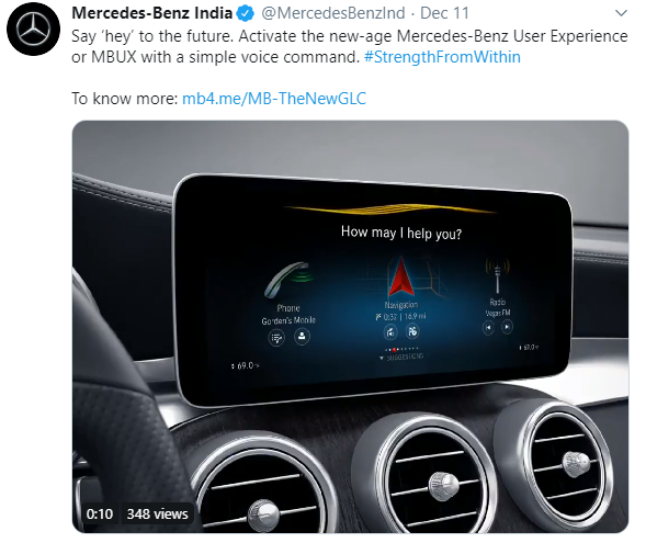On Twitter, Mercedes Benz India populates its feed with visuals from the interiors of the car models, rally snippets, product features, and highlights. With a 621K-strong follower base and 30.5K tweets, Mercedes Benz India attempts to keep the audience hooked through brand campaigns and snippets before product launches.