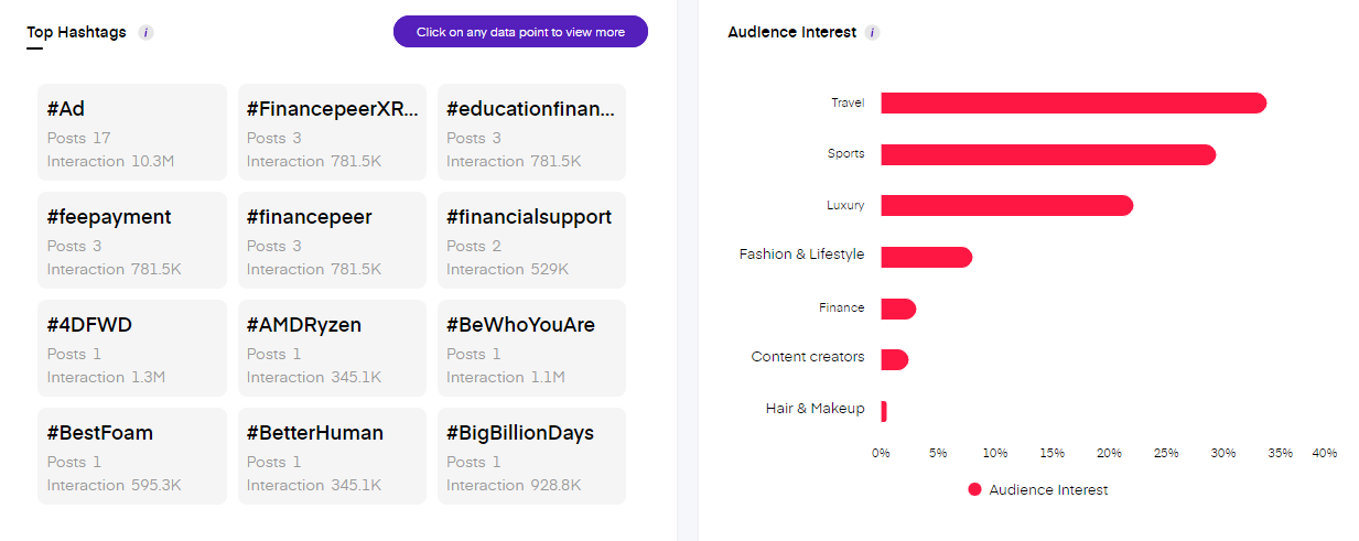 The tool gives you access to detailed reports that help you frame effective influencer strategies for the future. Get details on the influencers, content performance, audience demographics and engagement, influencer brand collaborations, and lots more.