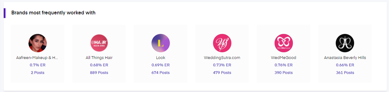 Discover influencers from different industries, tiers, and platforms with their handle or name. Check the brands they have collaborated with and get all the necessary insights for the influencers’ performance. The tool helps you with detailed metrics like engagement rate, interaction, content themes, most engaging posts, top hashtags, and audience interest.