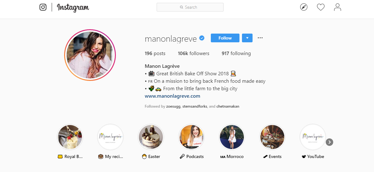 You can look at Manon Lagreve’s Instagram feed for inspiration. With a pop of colors, Manon’s feed would make most people stop and scroll through the content. Besides being aesthetically fine-tuned, her feed also helps establish her niche expertise in baking. A glimpse of her feed takes you through pictures of different cakes, bakes, and sweets.