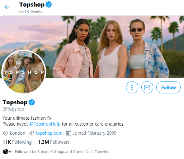 Popular clothing and apparel brand, Topshop uses its Twitter bio to lead its audience to their online helpdesk.